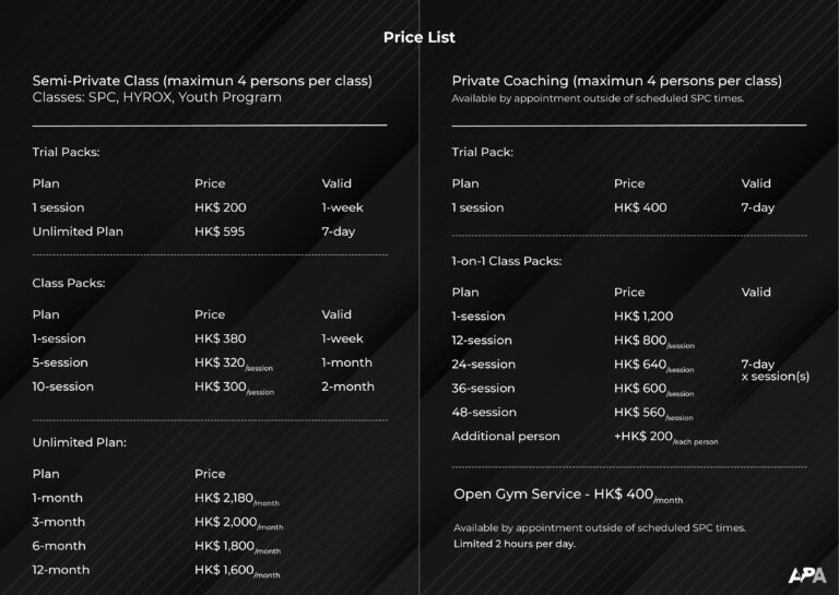The above rates are for one-on-one training mode, one-on-two or above only need to add an extra person $200/session (maximum one-on-four)